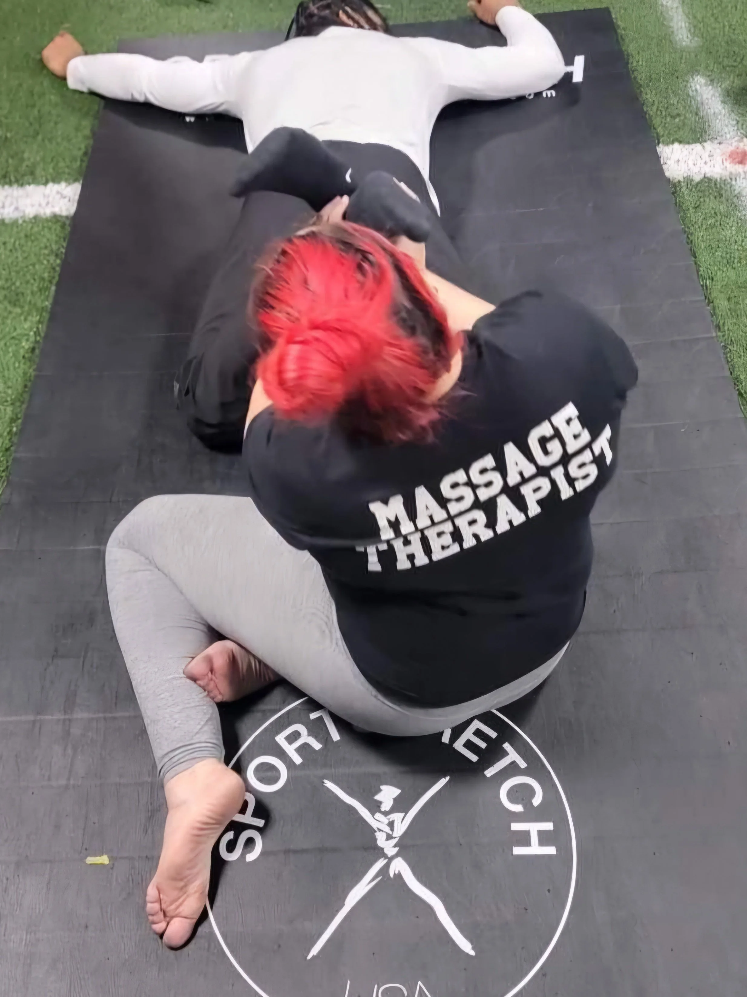 SportStretch® is a floor mat, movement based, full body routine that consists of both actively and passively stretching a client. It can be done as an individual treatment or integrated into the end of a massage. This work can be used as a warmup prior to activity, as it can invigorate an athlete and get them ready to move, or it can be applied as recovery work, to relax them after activity.